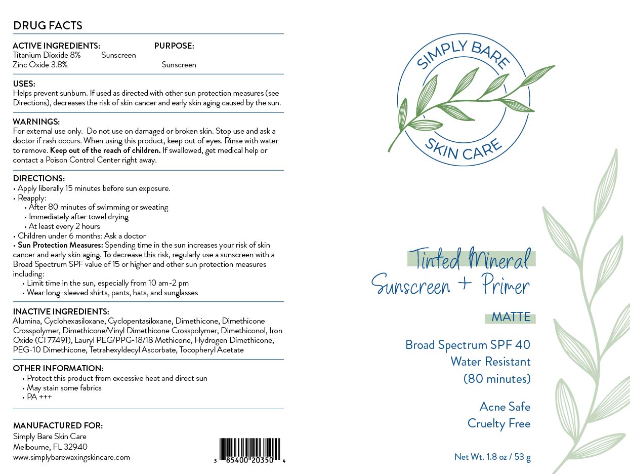 The following image provide visual information about the product associated with Tinted Mineral Sunscreen Plus Primer Matte NDC 85400-203 by Simply Bare Waxing & Skin Care Llc, such as packaging, labeling, and the appearance of the drug itself. This resource could be helpful for medical professionals, pharmacists, and patients seeking to verify medication information and ensure they have the correct product.