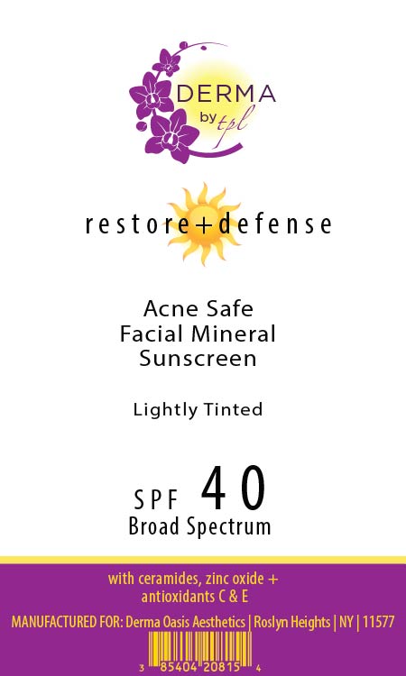 This is a description of a facial mineral sunscreen with a lightly tinted formula that is acne-safe and offers broad spectrum protection with SPF 40. It contains ceramides, zinc oxide, and antioxidants. The product is manufactured for Derma Oasis Aesthetics in Roslyn Heights, NY.*