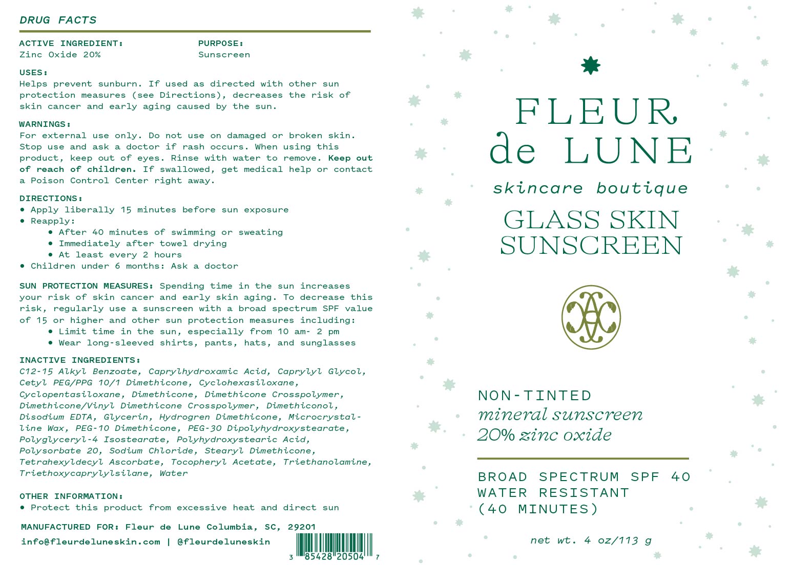 This information provides details about a mineral sunscreen called "Glass Skin Sunscreen" by Fleur de Lune. It contains 20% zinc oxide as the active ingredient, offering broad-spectrum SPF 40 protection. The sunscreen is non-tinted and water-resistant for up to 40 minutes. It is recommended for preventing sunburn and reducing the risk of skin cancer and premature aging caused by the sun. The product also includes a list of inactive ingredients and usage instructions, such as reapplying after swimming or sweating and limiting sun exposure during peak hours. It is crucial to keep the product away from children, refrain from ingesting it, and seek medical help if a rash occurs.*
