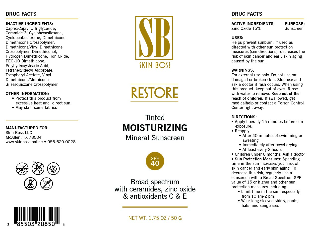 This is a description of a tinted moisturizing mineral sunscreen called Skin Boss RESTORE. The product contains ceramides, zinc oxide, and antioxidants C & E, offering broad-spectrum protection. The sunscreen helps prevent sunburn and reduces the risk of skin cancer and premature skin aging. It should be applied 15 minutes before sun exposure and reapplied every 2 hours or after swimming, sweating, or towel drying. The product is manufactured for Skin Boss LLC in McAllen, TX, and should be protected from excessive heat and direct sun. It comes in a 1.75 oz (50g) package and the active ingredient is 16% Zinc Oxide. Please remember to consult a doctor before using on children under 6 months and follow additional sun protection measures.*