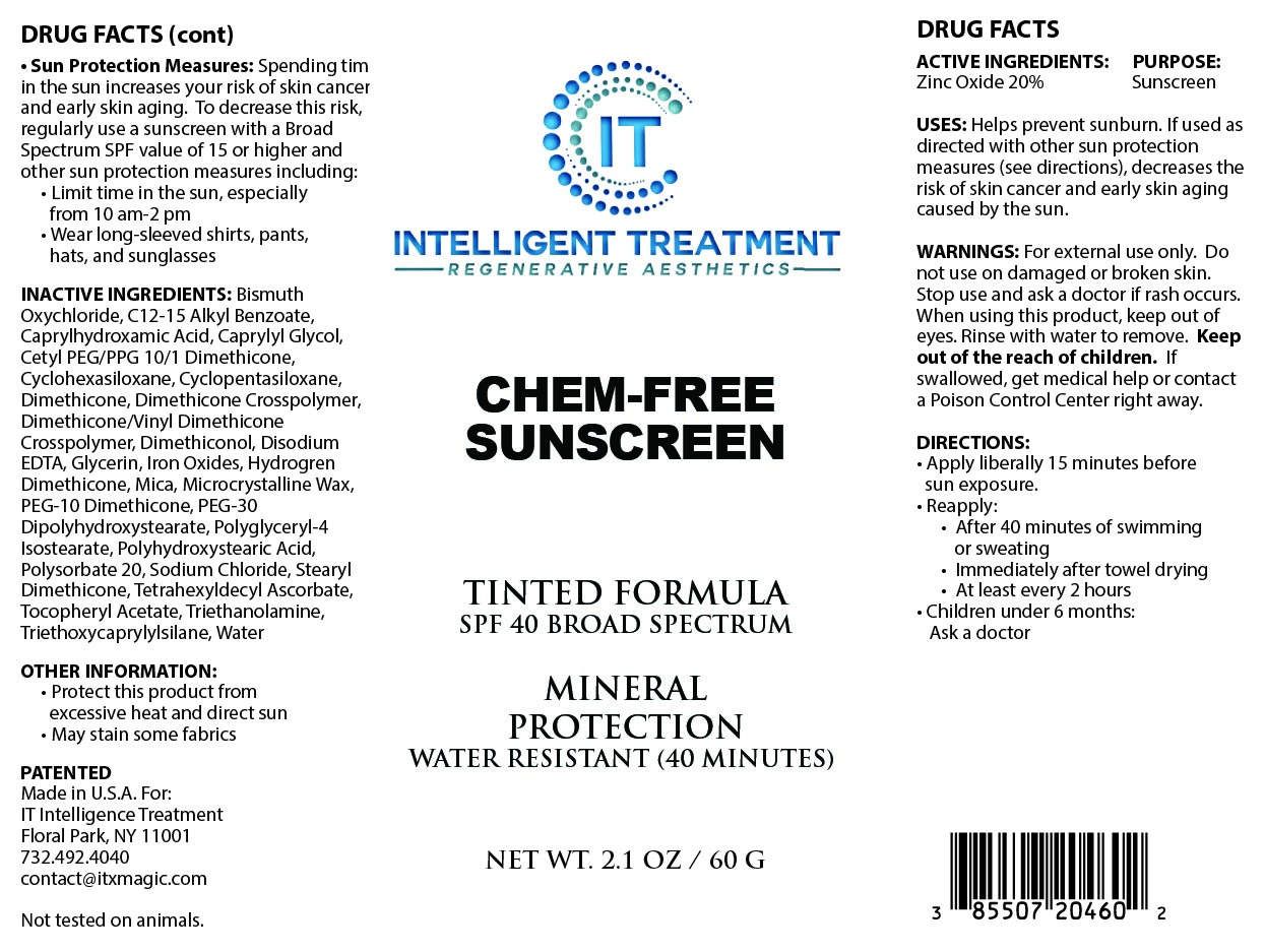 The following image provide visual information about the product associated with Chem Free Sunscreen Tinted Formula NDC 85507-204 by It Intelligent Treatment Llc, such as packaging, labeling, and the appearance of the drug itself. This resource could be helpful for medical professionals, pharmacists, and patients seeking to verify medication information and ensure they have the correct product.
