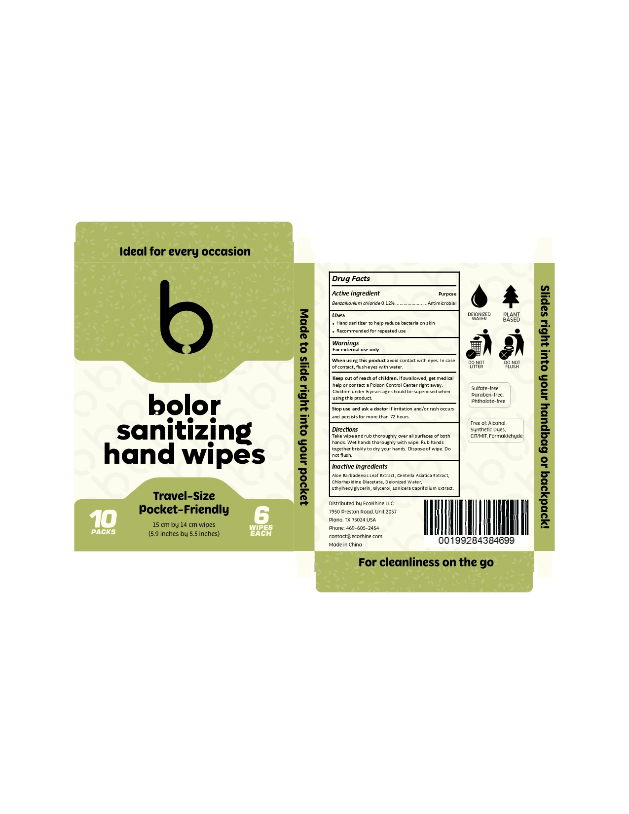 This is a description of a total of 60 packs of bolor sanitizing hand wipes. The wipes contain the active ingredient of Benzalkonium Chloride 0.12%, which is effective as a hand sanitizer to reduce bacteria on the skin. It is recommended for repeated use. The product comes with warnings for external use only, to avoid contact with eyes, and to keep out of reach of children. In case of eye contact, rinse with water and seek medical help if swallowed. The wipes should be used to thoroughly clean both hands before disposal. The wipes also contain various inactive ingredients such as leaf extract, Denzed water, and others. The product is distributed by EcoRhine LLC in the USA. It is sulfate-free, paraben-free, phthalate-free, synthetic dye-free, and free of formaldehyde and alcohol.*