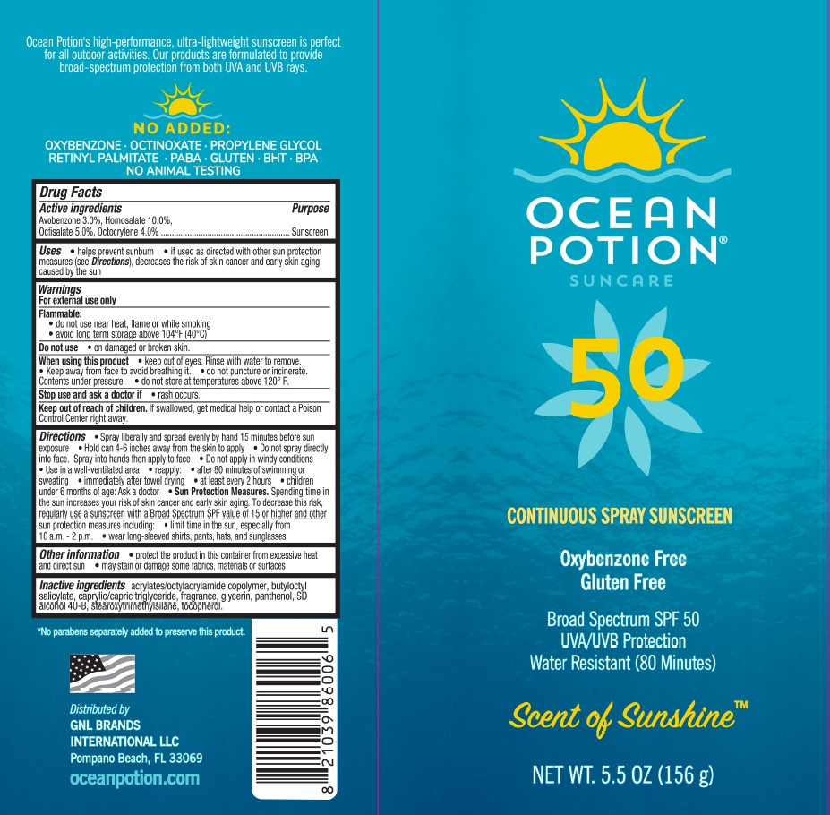 The following image provide visual information about the product associated with Ocean Potion Suncare 50 Continuous Sunscreen Scent Of Sunshine NDC 85638-002 by Gnl Brands International, Llc, such as packaging, labeling, and the appearance of the drug itself. This resource could be helpful for medical professionals, pharmacists, and patients seeking to verify medication information and ensure they have the correct product.