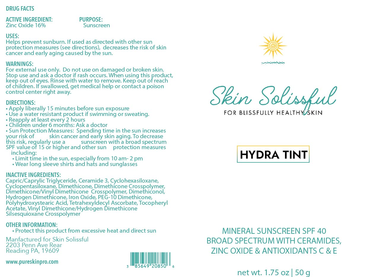 This text provides detailed information about a mineral sunscreen called Hydra Tint with SPF 40. The product contains active ingredient Zinc Oxide 16% which helps prevent sunburn and reduces the risk of skin cancer and early aging from sun exposure. It also includes directions for use, warnings, and a list of inactive ingredients. The sunscreen is water-resistant, and users are advised to reapply every 2 hours. The product is manufactured for Skin Solissful and can be found at pureskinpro.com.*