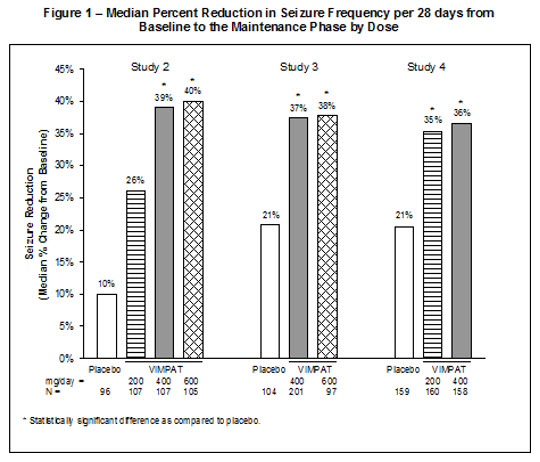 The text provides information on responder rates for Lacosamide in comparison to a placebo in studies 2, 3, and 4. It includes the responder rate for Lacosamide at different doses (200mg/day, 400mg/day, 600mg/day) and the placebo group. This data is represented in Figure 2 showing the proportion of patients by responder rate.*