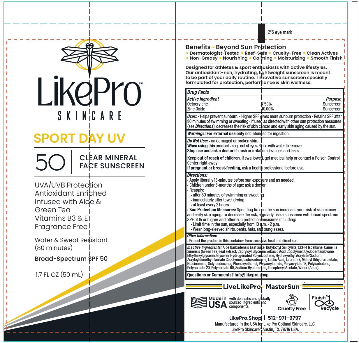 The following 2 images provide visual information about the product associated with Likepro Skincare Sport Day Uv Face Sunscreen Spf 50 NDC 85750-613 by Like Pro Optimal Skincare Llc, such as packaging, labeling, and the appearance of the drug itself. This resource could be helpful for medical professionals, pharmacists, and patients seeking to verify medication information and ensure they have the correct product.