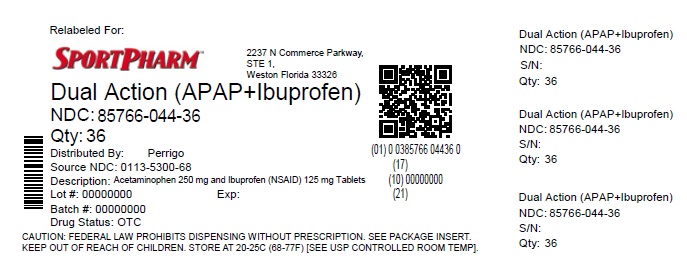 This is a description of a medication labeled as "Dual Action (APAP+Ibuprofen)" with NDC 85766-044-36, containing 250 mg of Acetaminophen and 125 mg of Ibuprofen. It is distributed by Perrigo and falls under the OTC category. The medication is presented in tablet form. It is important to note that dispensing without a prescription is prohibited by federal law, and the medication should be kept out of reach of children and stored at 20-25°C (68-77°F).*