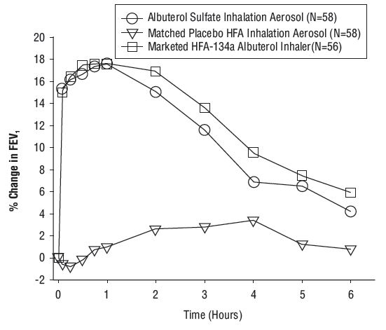 This text provides information about the change in Forced Expiratory Volume (FEV) after using different types of inhalers over a specified time period. It compares the effects of Albuterol Sulfate Inhalation Aerosol, Matched Placebo HFA Inhalation Aerosol, and Marketed HFA-134a Albuterol Inhaler. The study includes 58 participants for Albuterol Sulfate and Matched Placebo inhalers, and 56 participants for the Marketed Albuterol Inhaler. The data is presented in relation to the number of hours studied.*