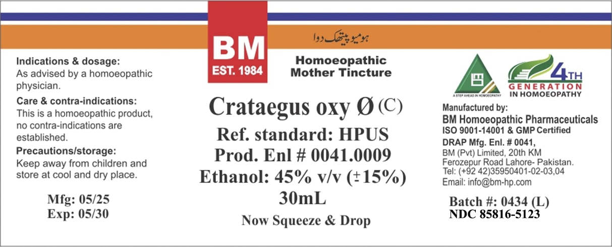The following image provide visual information about the product associated with Bm Crataegus Oxy NDC 85816-5123 by Bm Private Limited, such as packaging, labeling, and the appearance of the drug itself. This resource could be helpful for medical professionals, pharmacists, and patients seeking to verify medication information and ensure they have the correct product.