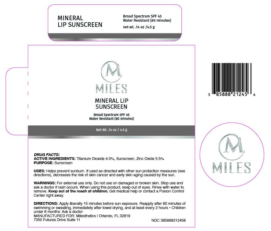 This is a mineral lip sunscreen with a broad spectrum SPF 45, which is water-resistant for 80 minutes. It contains active ingredients such as Titanium Dioxide and Zinc Oxide to protect against the sun's harmful rays. The sunscreen helps prevent sunburn if used as directed. The product has directions for application, reapplication, and warnings for external use only. It is manufactured for Milesthetics in Orlando, FL.*
