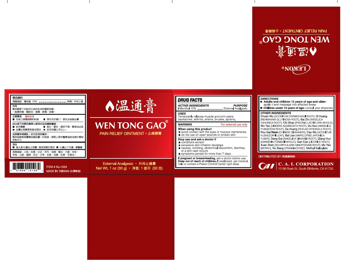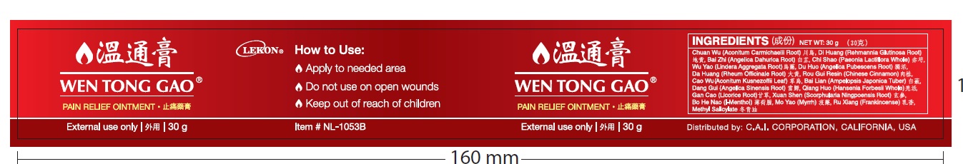 This is a description of a pain relief ointment called "WEN TONG GAO". It contains various ingredients blended to provide relief when applied to the affected area. The instructions recommend applying it only to the needed area, avoiding open wounds, and keeping it away from children. This ointment is for external use only and comes in a 30g container. The product is distributed by C.A.I. Corporation, based in California, USA.*
