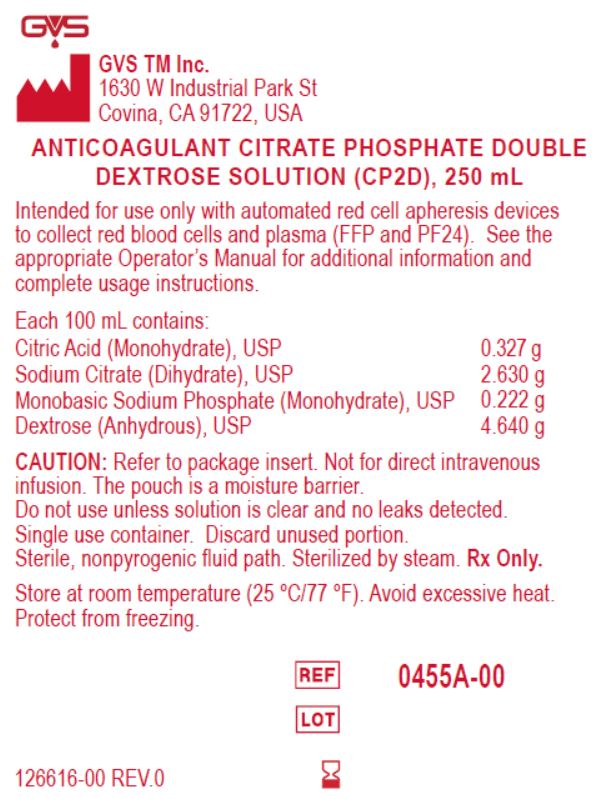 This text provides information about an Anticoagulant Citrate Phosphate Double Dextrose Solution (CP2D) intended for use with automated red cell apheresis devices. It contains citric acid, sodium citrate, monobasic sodium phosphate, and dextrose. The solution is sterile, nonpyrogenic, and for single-use only. It is important to refer to the package insert and to store it at room temperature, protecting it from freezing.*