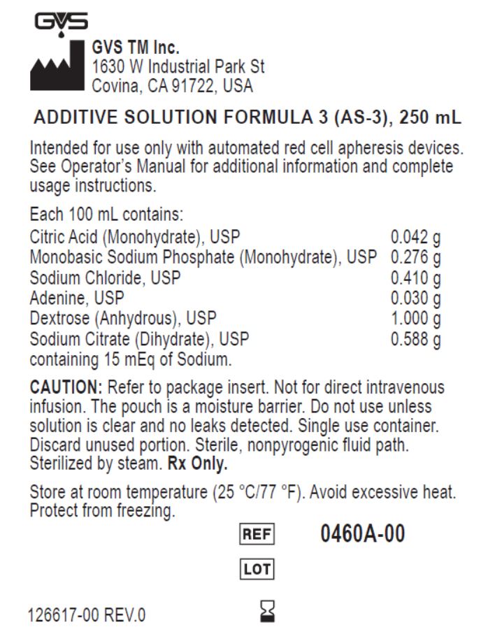 This is a description of a medical product called "ADDITIVE SOLUTION FORMULA 3 (AS-3), 250 mL" by GVS TM Inc. The solution is intended for use with automated red cell apheresis devices. Each 100 mL contains various components such as citric acid, sodium phosphate, sodium chloride, adenine, dextrose, and sodium citrate, with 15 mEq of Sodium. It is important to follow the instructions provided in the Operator's Manual. The solution should not be directly infused intravenously and the package should be checked for leaks before use. The product is sterilized and for single-use only. It should be stored at room temperature and protected from freezing.*