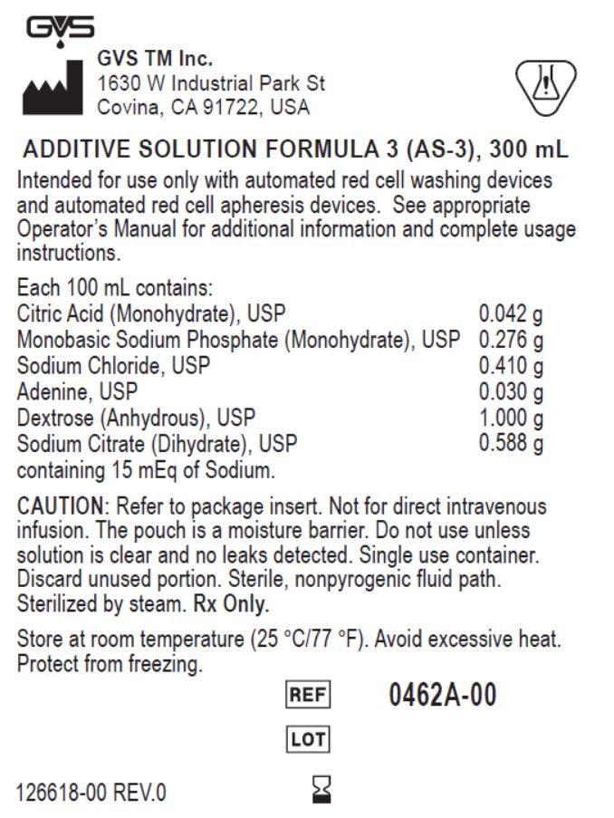 This text is a product description for ADDITIVE SOLUTION FORMULA 3 (AS-3) from GVS TM Inc. It is intended for use with automated red cell washing and apheresis devices. The solution contains various components such as citric acid, sodium phosphate, sodium chloride, adenine, dextrose, and sodium citrate, providing 15 mEq of Sodium. It includes cautionary notes and instructions for storage. Each container is for single use only.*