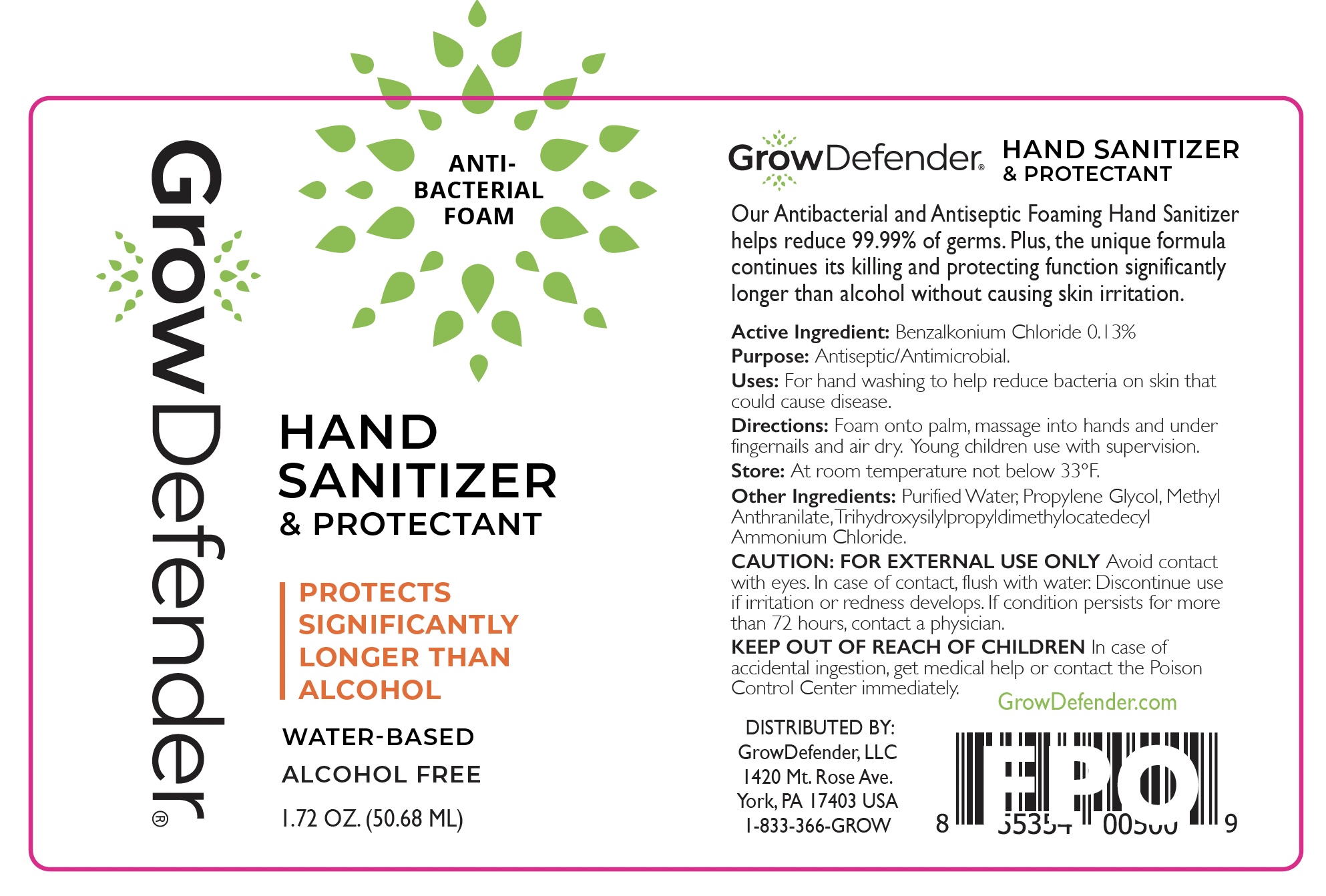 Entire label includes principal display panel - growdefender antibacterialfoam 1.72oz label copy