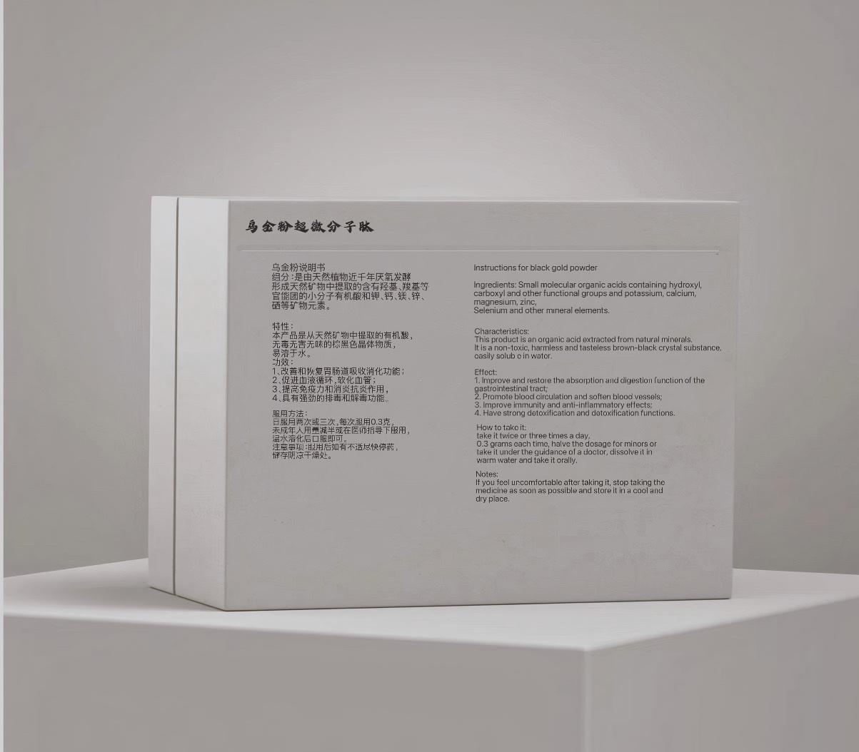 Description: The text provides instructions for using black gold powder, which is made of organic acids extracted from natural minerals and contains potassium, calcium, magnesium, and other minerals. The powder is described as a non-toxic, harmless, and fast-dissolving substance. It is intended to improve gastrointestinal function, promote blood circulation, enhance immunity, and have detoxification properties. The recommended dosage is to take it two or three times a day, dissolved in warm water for oral consumption. In case of discomfort, it is advised to discontinue use and store the powder in a cool, dry place.*