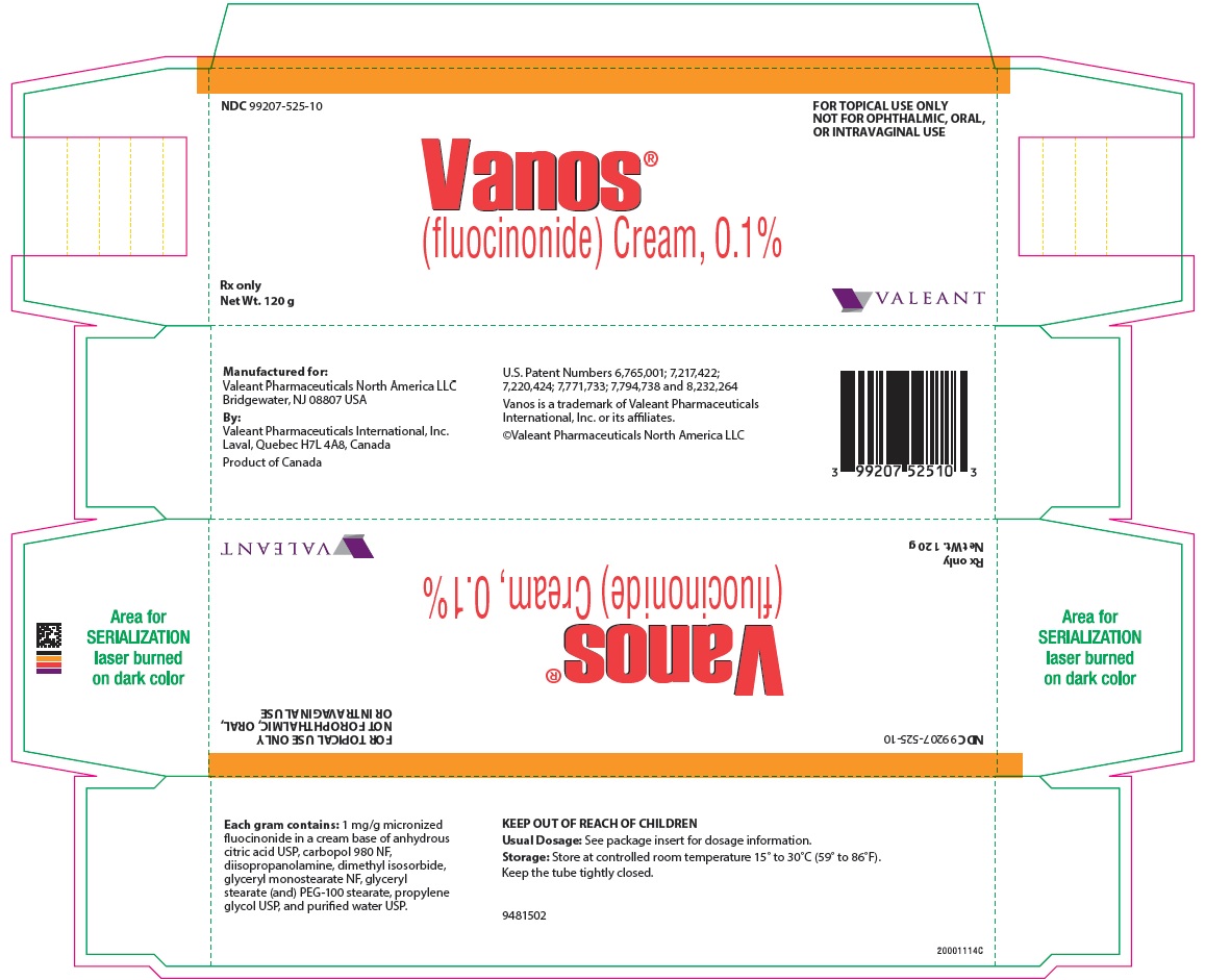 NDC 99207-525-10 FORTOPICAL USE ONLY. NOT FOR OPHTHALMIC, ORAL, OR INTRAVAGINAL USE. This is a cream containing Fluocinonide that belongs to the corticosteroid class of drugs. It is manufactured by Valeant Pharmaceuticals North America LLC and is not indicated for use in the mouth, vagina, or eyes. The package comes with a product insert that contains proper dosage and usage information. The product is packaged in a container with a serialization number burned using a laser on a dark-colored background. The product should be kept away from children and stored at room temperature. The cream contains several ingredients such as glyceryl monostearate NF, glyceryl stearate, PEG-100 stearate, and purified water USP.*
